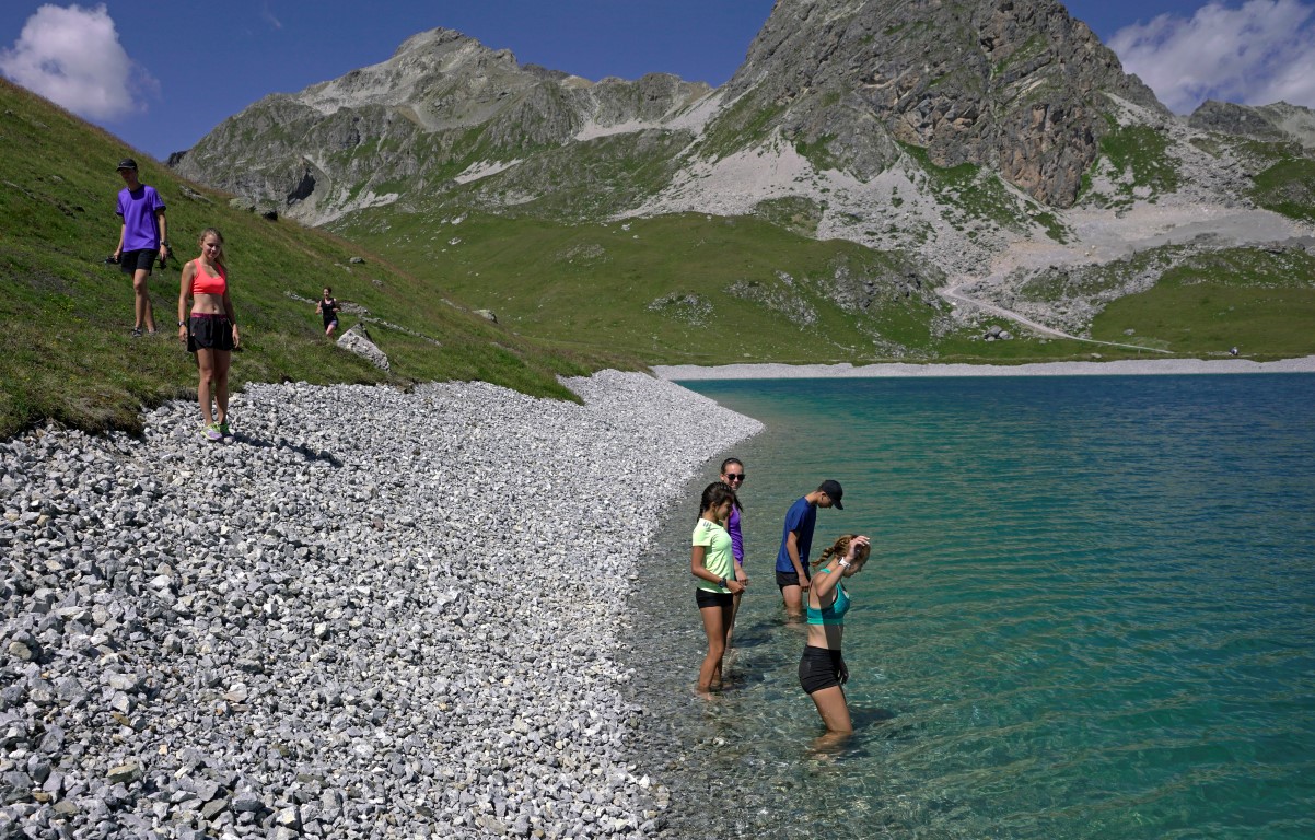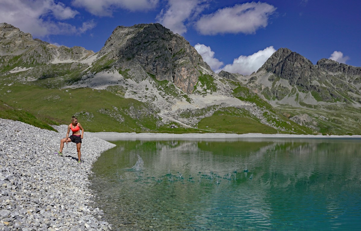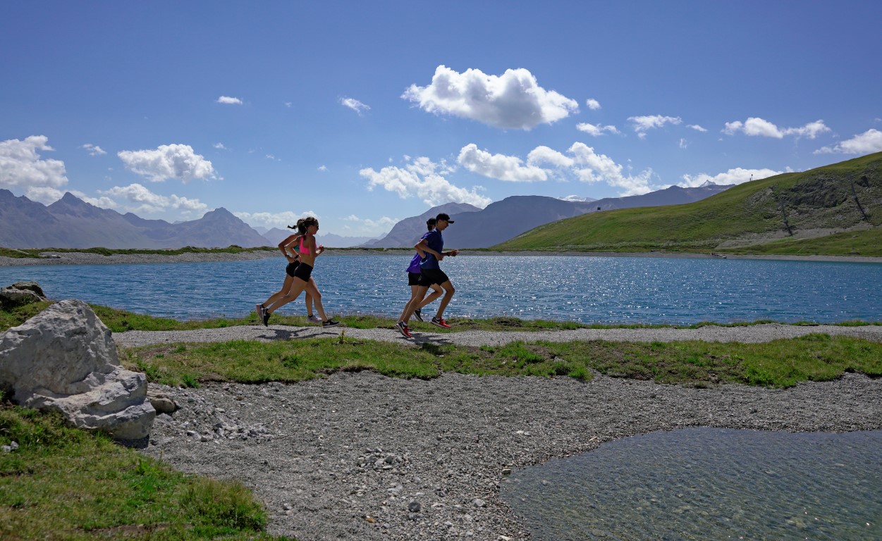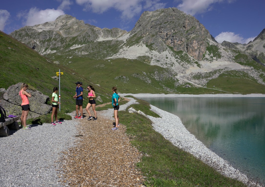 Die Läufer begaben sich am Vormittag mit den Bikes hinauf auf die Corviglia zum neu eröffneten Höhentrainingszentrum. Was sie dann zu sehen bekamen, überstieg viele Vorstellungen von einem Naturschauspiel. Der neu erstellte Höhensee mit den Laufbahnen rundherum aus Kies und Holzschnitzel (Finnenbahn) liegt nämlich so schön in die Natur eingebettet, wie man es sich fast nicht vorstellen kann. Meiner Meinung nach ein sehr aussagkräftiger Ort. Diese ruhige und wunderschöne Umgebung motiviert förmlich zum innehalten oder sich ganz einfach zu bewegen.